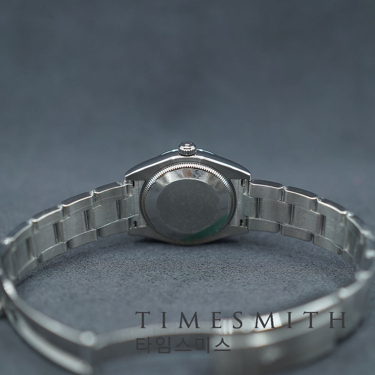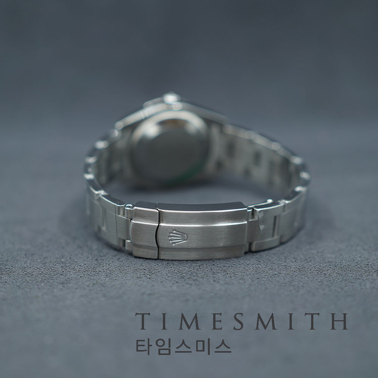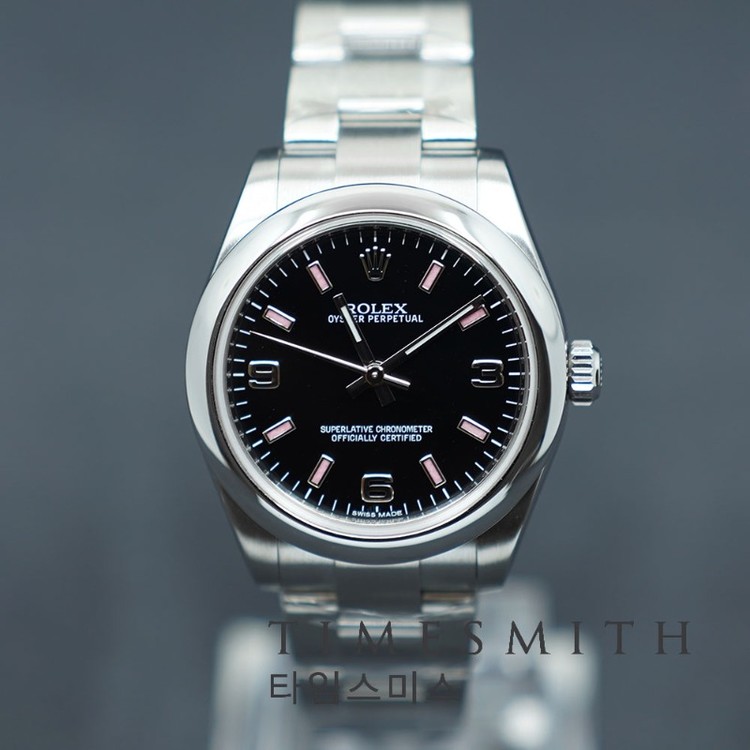 블랙 다이얼에 핑크 인덱스가 포인트로 들어간 오이스터 퍼페추얼 31 177200입니다.