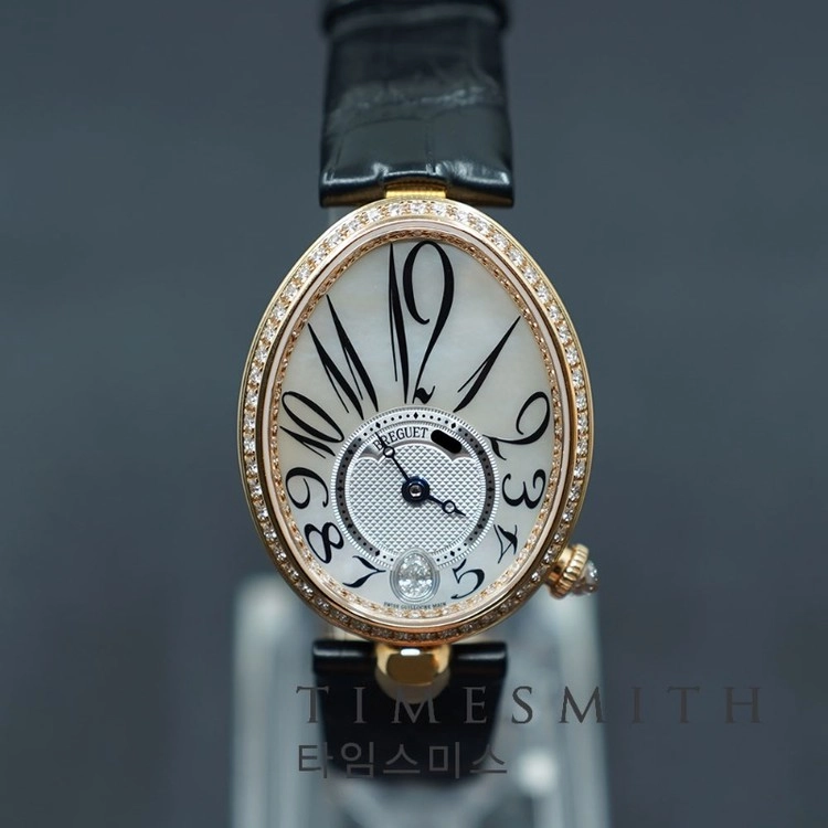 우아한 타원형 케이스와 다이아몬드 세팅이 조화를 이루는 브레게 레인 드 네이플 8918BR입니다.